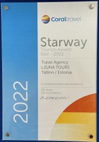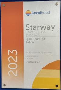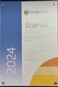 STARWAY 2024 Компания Ljuna Tours три года подряд - в 2022, 2023 и 2024 годах - награждается престижной премией Starway от туроператора Coral Travel. Эта награда вручается лучшим агентствам за высокие показатели продаж и профессионализм.