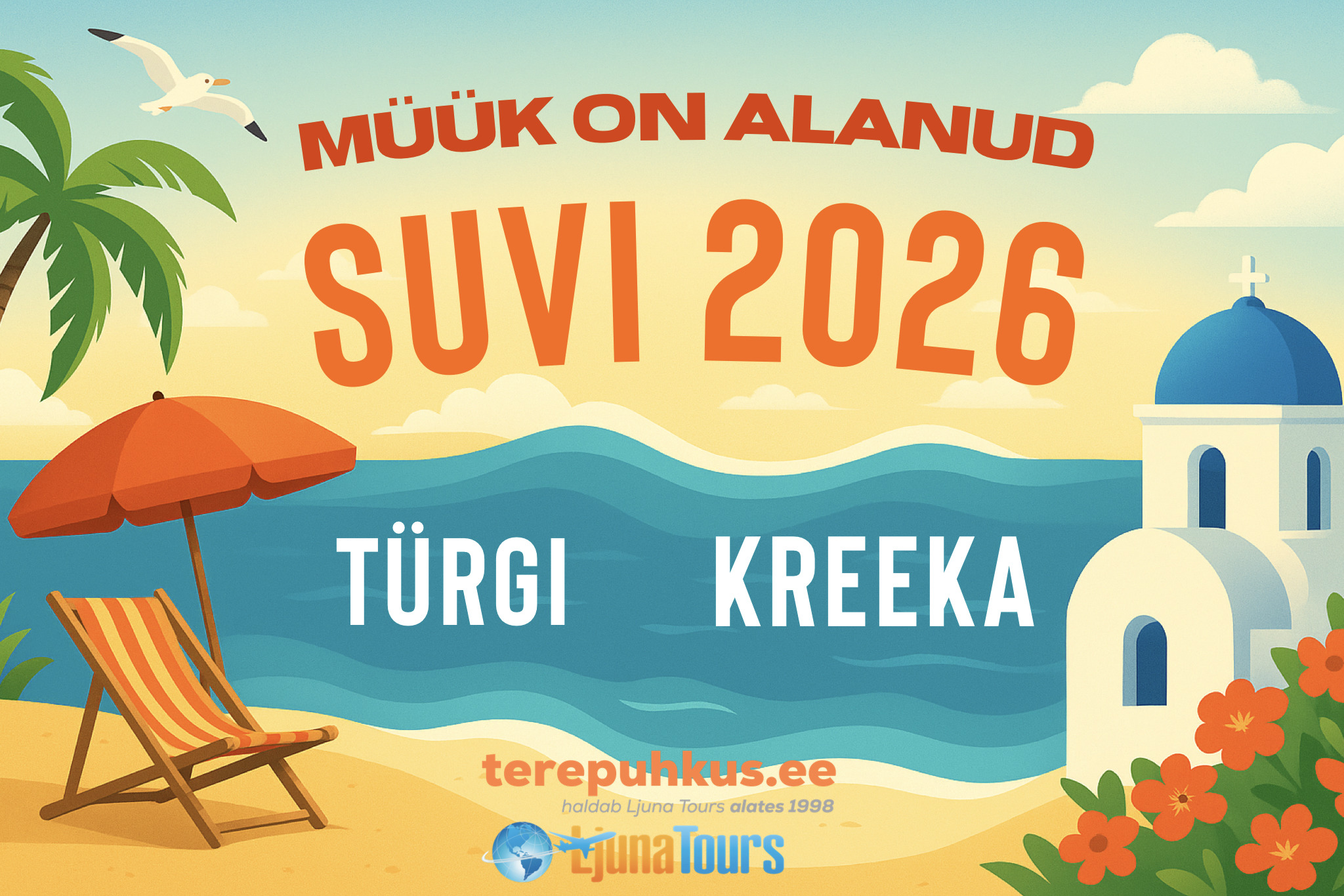 SUVI 2026 kuulub sulle!  Eelmüügi esimesest valikust leiad populaarsete sihtkohtade – Türgi ja Kreeka saarte reisid! Reisihuviliste rõõmuks on taas saadaval imekauni Korfu saare paketid ning TOP sihtkohtadest Kreeta ja Türgi, mille valikust leiad mitmeid tippklassi hotelle, samuti preemiumklassi tubasid.